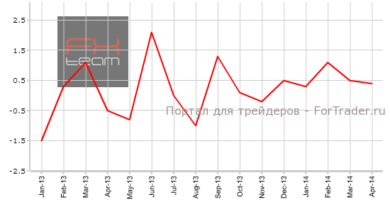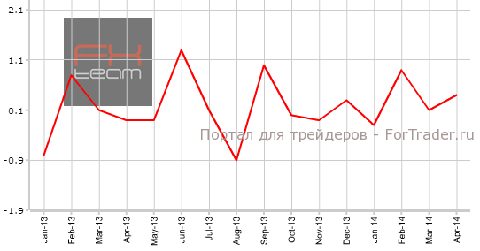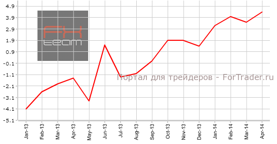 Изменение объема производства перерабатывающей промышленности является основой промышленности. Значение данного показателя в апреле зафиксировано на уровне 0.4% м/м (4.4% г/г). Прогноз составлял 0.4% м/м (4.0% г/г). Предыдущее значение находилось на отметке 0.5% м/м (3.5% г/г).