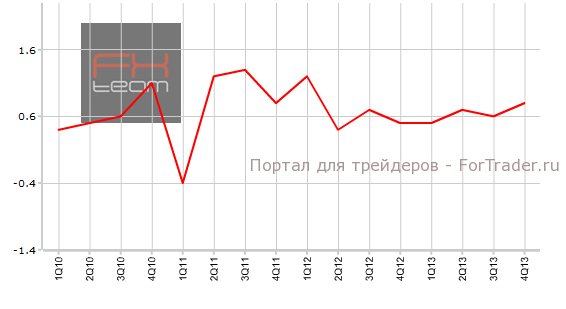 Изменение объема ВВП за 4 квартал составило 0.8% кв/кв (2.8% г/г). Рынок ожидал значений несколько ниже, на уровне 0.7% кв/кв (2.5% г/г). На деле же рост оказался выше, чем в прошлом квартале, когда показатель составил 0.6% кв/кв (2.3% г/г).
