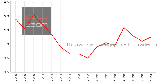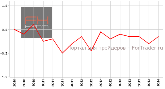 Изменение объема ВВП составило 0.5% кв/кв (2.0% г/г). Прогноз находился на уровне 0.6% кв/кв (1.9% г/г). Тем самым квартальный прогноз не оправдался в отличие от годового. Предыдущее значение составляло 0.2% кв/кв (1.7% г/г).