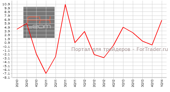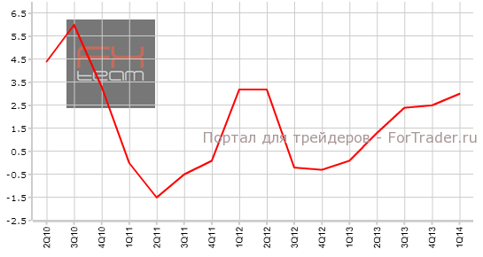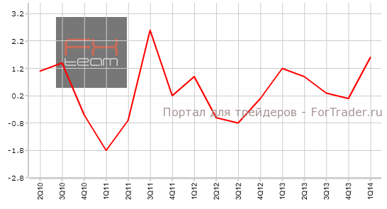 Окончательные данные по изменению объема ВВП были пересмотрены с уровня в 1.5% кв/кв (3.0% г/г) до значения 1.6% кв/кв (3.0% г/г). Прогноз ориентировался на изменение в отрицательную сторону, до 1.4% кв/кв.