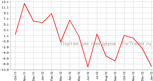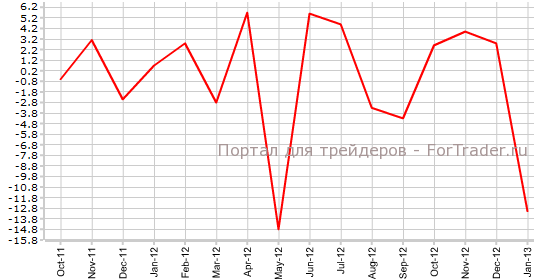 Согласно вышедшим 11 марта официальным данным, базовые заказы на машины и оборудование в Японии в январе снизились на 13,1% по сравнению с предыдущим месяцем и на 9,7% против аналогичного периода 2012 года. Экономисты прогнозировали, что заказы упадут на 1,4% в месячном исчислении и на 0,3% в годовом.