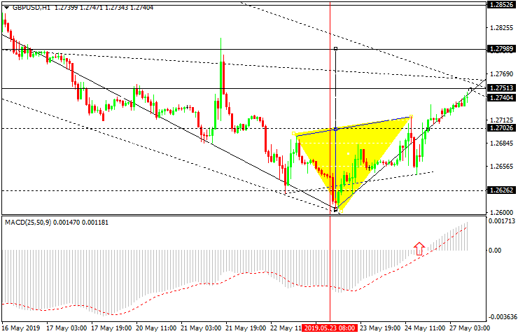 На графике H1 валютная пара GBPUSD смогла на минимумах сформировать разворотную фигуру “Голова-плечи”. А с пробоем уровня 1.2700 отправила рынок на отработку первой цели роста — 1.2800. Сегодня актуально рассмотреть отработку уровня 1.2751. После этого рассмотрим возможность коррекции к 1.2700. Затем -рост к уровню 1.2800. Такую волну рассмотрим как первую по тренду вверх. Практически рынок предлагает рассмотреть завершение краткосрочной тенденции на снижение и начало новой тенденции в коррекцию.