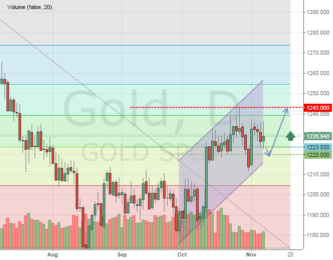 Конечно, существуют риски формирования боковой консолидации по золоту внутри канала 1234 — 1224, но в долгосрочной перспективе золото продолжит рост.