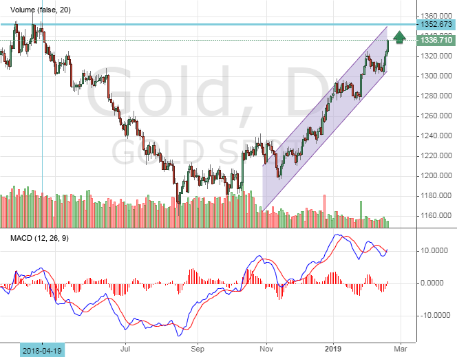 Неопределенность в переговорах между США и Китаем и приближение дедлайна заставляют инвесторов вкладывать капитал в защитные активы, что привело к росту цены на золото. Поддержал рост котировок и повысившийся спрос на драгоценный металл со стороны Центробанков развивающихся стран. В результате, цена на золото смогла обновить локальный максимум на отметке 1327,33 долл/унция.