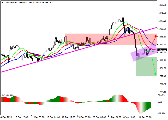 Котировки актива продемонстрировали значительную нисходящую коррекцию и вернулись в глобальный нисходящий канал. Технические индикаторы продолжают удерживать локальный сигнал на продажу. Быстрые EMA индикатора «аллигатор» находятся ниже сигнальной линии, а гистограмма осциллятора AO торгуется в отрицательной зоне.