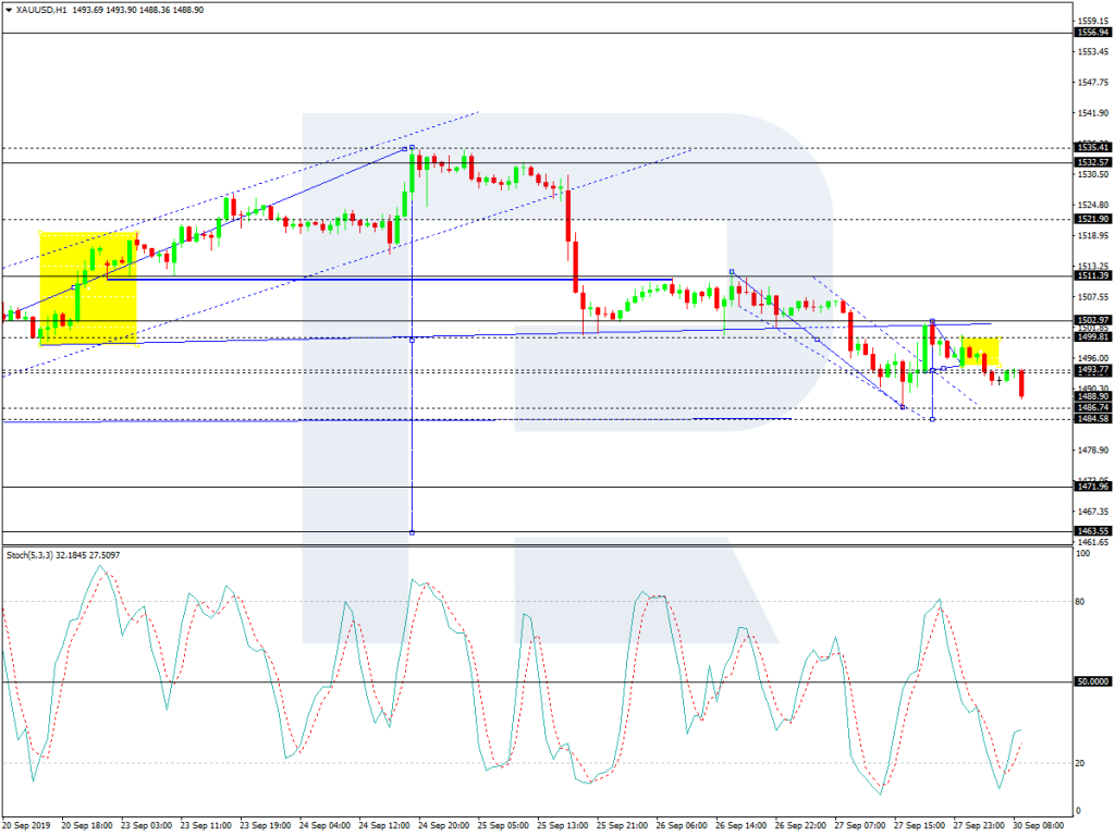 На 1-х часовом графике XAU/USD золото торгуется с отбоем от уровня 1502.95 вниз. Рассматривается такая структура как пятая волна по тренду вниз на отработку уровня 1463.60. Сегодня вероятен сценарий развития звена снижения к уровню 1484.60. Затем возможность коррекции к уровню 1493.77. Далее — снижение по тренду вниз.