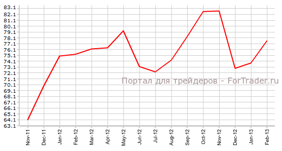 В феврале 2013 года индекс Мичиганского университета показал увеличение с отметки 73,8 до 77,6, превысив прогноз экономистов, не ожидавших никаких изменений. В марте аналитики финансовых рынков прогнозируют увеличение предварительного значения индекса потребительской уверенности в до уровня 78,2.