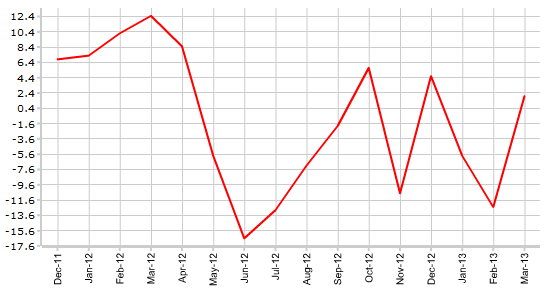 В марте 2013 года индекс производственной активности ФРБ Филадельфии вырос с отметки -12,5 до уровня 2,0, превзойдя ожидаемое экономистами значение -2,0. В апреле аналитики финансовых рынков ожидают дальнейшего роста индекса до отметки 3,1.