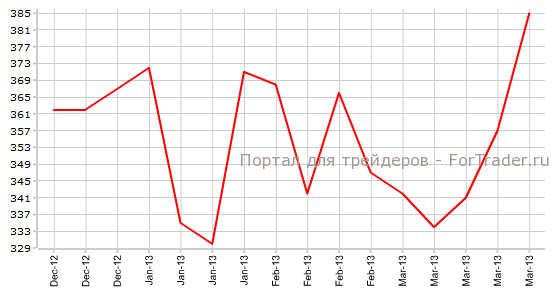 За неделю с 24 по 30 марта количество заявок на пособие по безработице выросло с уровня 357K до отметки 385К, против ожидаемого снижения до значения 350K. За неделю с 31 марта по 6 апреля аналитики финансовых рынков ожидают снижения количества обращений за пособием по безработице до отметки 362К.