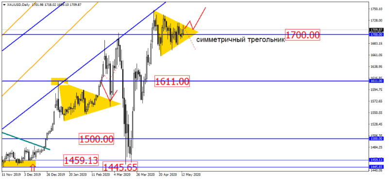Золото все дальше закручивается в дневной симметричный треугольник, но упорно закрывает дневные свечи выше «психологической» отметки в 1700.00. Ориентировочный сценарий разрешения треугольника – пробой верхней стороны, но также не забываем, что всё-таки треугольник – фигура неопределенности. Поэтому вариант похода котировок вниз тоже не стоит сбрасывать со счетов: