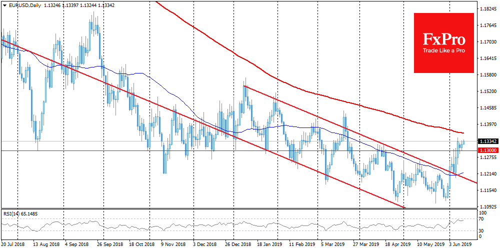 Единая валюта провела вторник преимущественно в диапазоне шириной в 15 пунктов, прибавив по итогам дня с 1.1310 до 1.1325. Несмотря на сравнительно вялый старт недели, все же стоит отметить сохранение тяги к росту по EURUSD, так как евро удается избежать значимых коррекций после разворота на повышение 31 мая. Новой проверкой бычьих настроений рынков может стать 200-дневная средняя, которая в настоящий момент проходит через 1.1360. Рынок консолидируется на подходе к этой отметке. Взятие резким движением этого уровня сформирует сильную тенденцию по направлению пробоя. То есть в нашем случае, способно усилить рост.