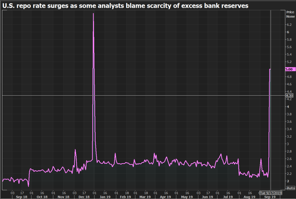 Считается, что за скачком краткосрочных ставок в Штатах стоят крупные квартальные налоговые выплаты и расчеты за покупку гособлигаций, объемное размещение которых можно было наблюдать в конце прошлой недели. Но все эти выплаты были запланированы, что наталкивает на мысль о хрупкости финансовой системы в настоящий момент.
