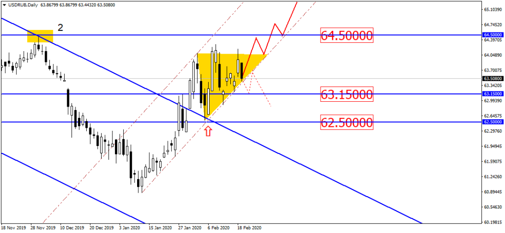 Рубль вторую неделю забивается в восходящий треугольник, который сигнализирует о том, что пара USD/RUB собирается с силами, чтобы пробить уровень 64.50 — примем это за базовый сценарий. Также не отбрасываем план «Б» – пробитие ценой треугольника вниз. Все-таки это треугольник, который может послужить и фигурой разворота. В общем, ближайшие дни покажут, в какую сторону разрешится наш треугольник: