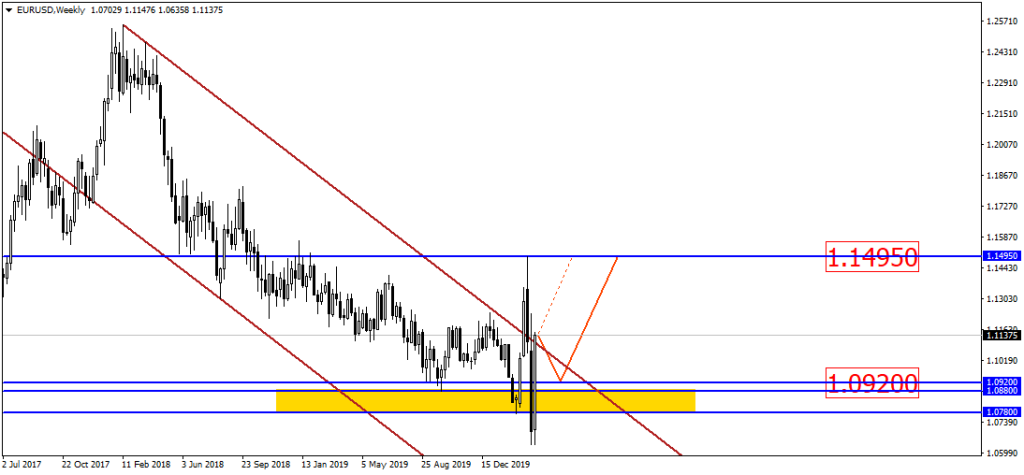 Пара EUR/USD закрыла неделю большим и красивым поглощением, которое сформировалось на области поддержки. Также стоит обратить внимание на тот факт, что свеча закралась над пробитым нисходящим каналом, что может быть еще одним свидетельствованием того, что цена ориентируется на рост. Сценариев здесь два – или возвращение к середине поглощения (уровень 1.0920) с последующим отскоком вверх, или же рост при открытии рынка. Потенциальный уровень роста пока видится в районе уровня 1.1495: