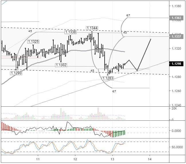 Если подберемся быстро к 45 градусу, то тогда стоит ожидать срывания защитных стопов выше 1,1348. Так как тэговый диапазон горизонтальный, то рост после прорыва будет сдержанным. Сессионный тренд ожидаем на американской сессии. До Штатов стохастик должен перейти в зону покупок.