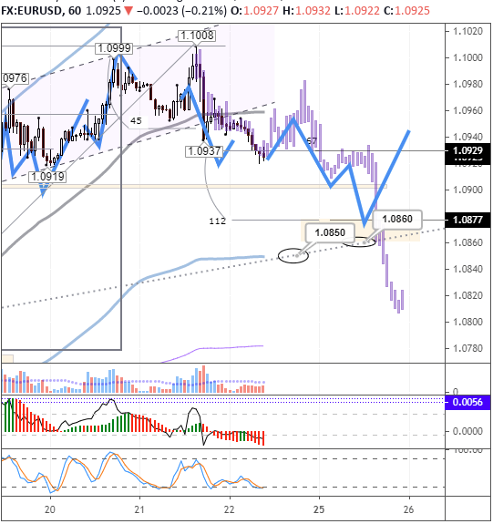 Первый значимый уровень — это 1,0902. От него начали формироваться три вершины. Цена часто возвращается к этому месту, чтобы возобновить рост. Мы же считаем, что продавцы будут отрабатывать дивергенцию и двойную вершину. По линии d3 цель находится в районе 1,0850-1,0860. Через эту зону проходит трендовая линия. Потом мы копируем свечи восходящего движения с 1,0800 до 1,0999 и переворачиваем их зеркально. Сейчас цена точно идет по этому сценарию.