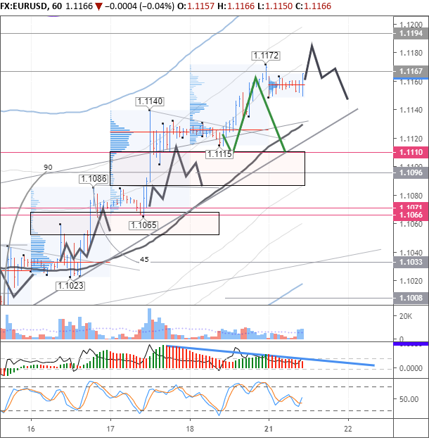 По прогнозу ждем обновления максимума и потом откат к lb. Цена находится около трендовой линии, поэтому хочется посмотреть, каким будет отскок, чтобы понять намерения покупателей. В пятницу был рост, сегодня нужно было рассматривать понедельник против пятницы. Из-за геополитики и кроссов с евро коррекцию рассматриваем после обновления максимума.