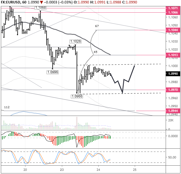 Если продавцы и не обновят минимум, то, по крайней мере, могут вернуть курс к 1,0966 за счет снижения кроссов с евро. По прогнозу мы рассмотрели падение до 1,0970. Даже при коррекции до 1,0975 будут выполнены условия для коррекции.