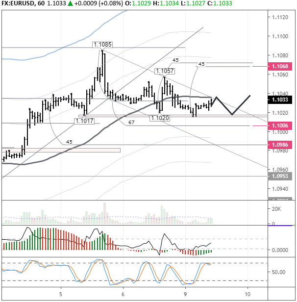 После публикации NFP евро укрепился к доллару и ослабился после выступления Пауэлла. На момент написания обзора евро стоит 1,1030. Цена застопорилась между сопротивлением от балансовой линии и поддержкой 1,1020. Выше балансовой линии проходит верхняя линия нисходящего канала. Если цена выйдет вверх из него, то тут нужно смотреть на настроения участников рынка и защитные активы. При повышенном аппетите к риску цена может вернуться к 45 градусу — 1,1068. Сегодня понедельник. В этот день трейдеры строят планы до конца недели. Цена может пойти в любую сторону. Так как осциллятор стохастик находится сверху, то по прогнозу рассмотрели боковое движение выше поддержки 1,1020.