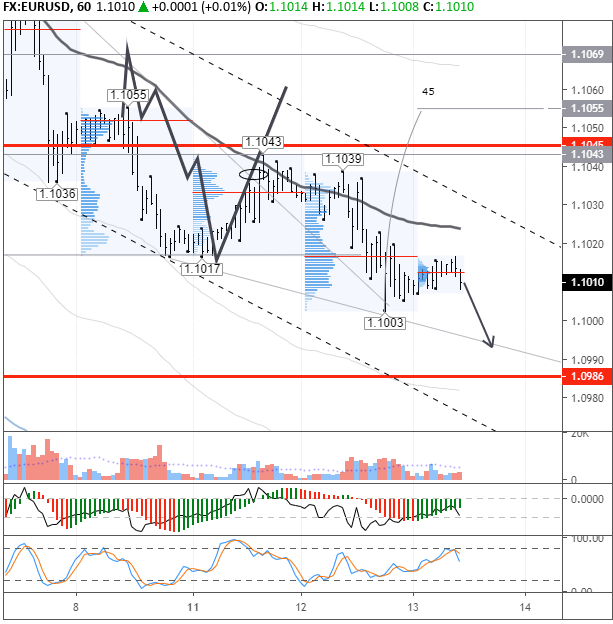 На момент публикации обзора евро стоит 1,1008. Пара остается торговаться в «медвежьем» тренде и в ближайшие пять часов рискует упасть ниже 1,10. Цель по прогнозу на первую половину европейской сессии — 1,0995. В моменте продавцы могут протестировать область 1,0985. Если евро будет ослабляться на фоне роста доллара и снижения кроссов с евро, то падение ускорится до 1,0971.
