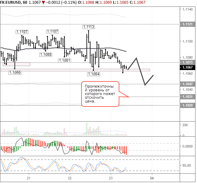 Как и ожидалось, цена не вышла из бокового тренда. Поддержка 1,1066 сдержала продавцов. По времени и волновой структуре возросли риски для снижения к уровню 1,1047. Так как флэт длится 6 дней 18 часов с 16 августа, то не стоит рассматривать падение цены до 1,1020. Выделим промежуточный уровень 1,1047, от которого цена может отскочить вверх.