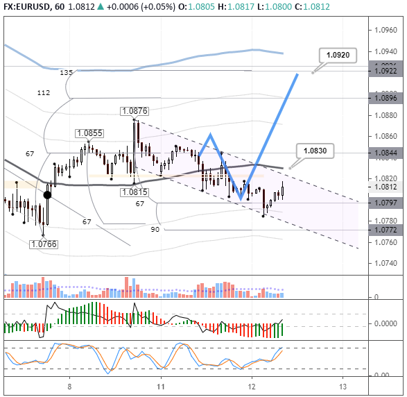 Мы считаем, что коррекция к восходящему движению завершилась. Прогноз корректировать не стали, но изменили канал. Покупателям нужно пробить сопротивление 1,0830, чтобы выйти на путь к 1,0920.