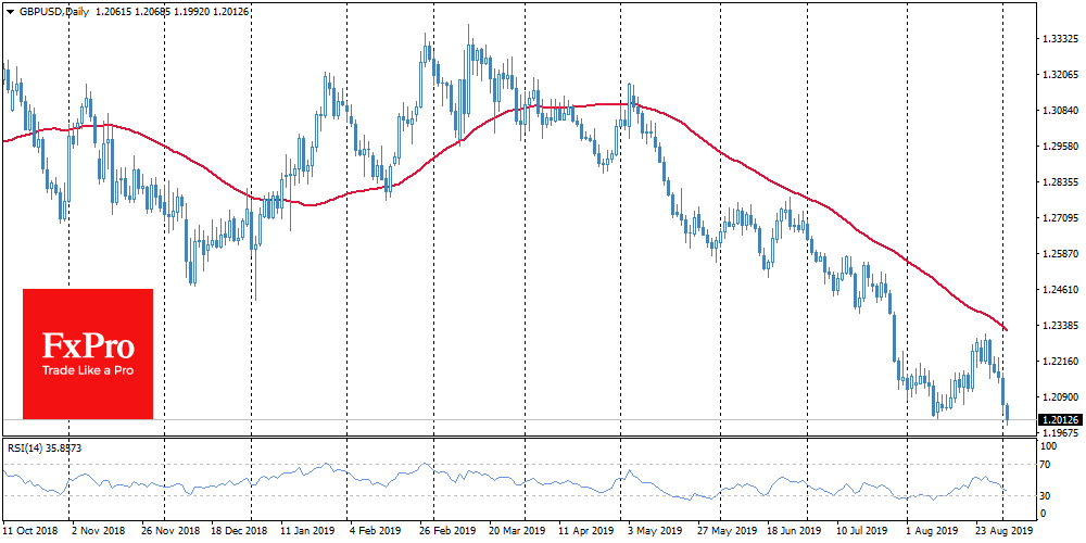 Британский фунт снижается пятую торговую сессию подряд. Новая волна страхов перед последствиями Brexit вернула GBP в область 36-летних минимумов: в какой-то момент сегодня утром он провалился под 1.2000. Позже во вторник состоится голосование о проведении досрочных выборов и возможности блокировки выхода из Евросоюза без сделки. Однако шансы такого исхода невелики, поскольку большинство голосов – у правящей партии. Это вызывало давление на валютном и долговом рынках, которые сейчас крайне негативно оценивают сложившуюся ситуацию. Исходя из этой логики, фунту придется несладко в случае провала указанных выше инициатив.