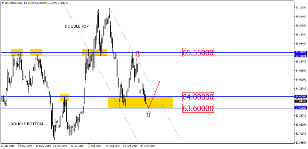 Рубль вновь зашёл в зону поддержки, образованной уровнями 64.00 и 63.60, поэтому потенциально пара может отскочить от нижней стороны зоны поддержки – уровня 63.60, в сторону 65.55: