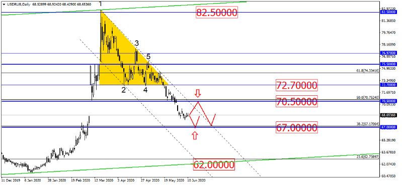 Пара USD/RUB, с наступлением лета, решила взять себе отпуск и до минимума снизить волатильность, формируя только маленькие дневные свечи в узком диапазоне. Пока базовый сценарий остаётся прежний – поход к сильной поддержке 67.00 или отскок от сопротивления в районе 70.50: