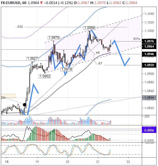 Ожидания по вчерашнему дню оправдались. Рост котировок был резким и остановился около 1,10. К настоящему времени коррекция к вчерашнему дню составила 76%. На момент написания обзора евро стоит 1,0974. Цена скорректировалась до балансовой линии и возобновила рост.