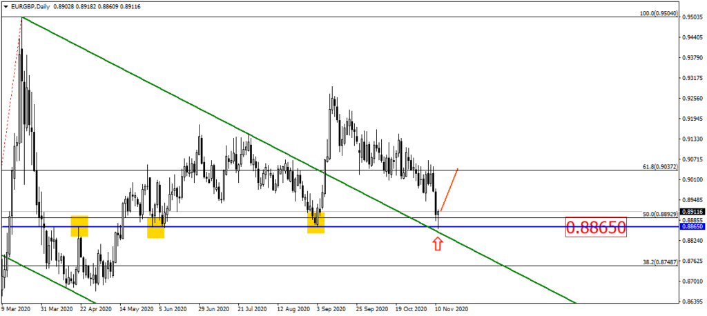 Кросс-курс EUR/GBB разрисовывает интересную картинку. Сегодняшний день собирается закрыться молотом, который упирается в важную поддержку 0.8865, а также пробитый даунтренд. Пока ситуация складывается в сторону роста котировок: