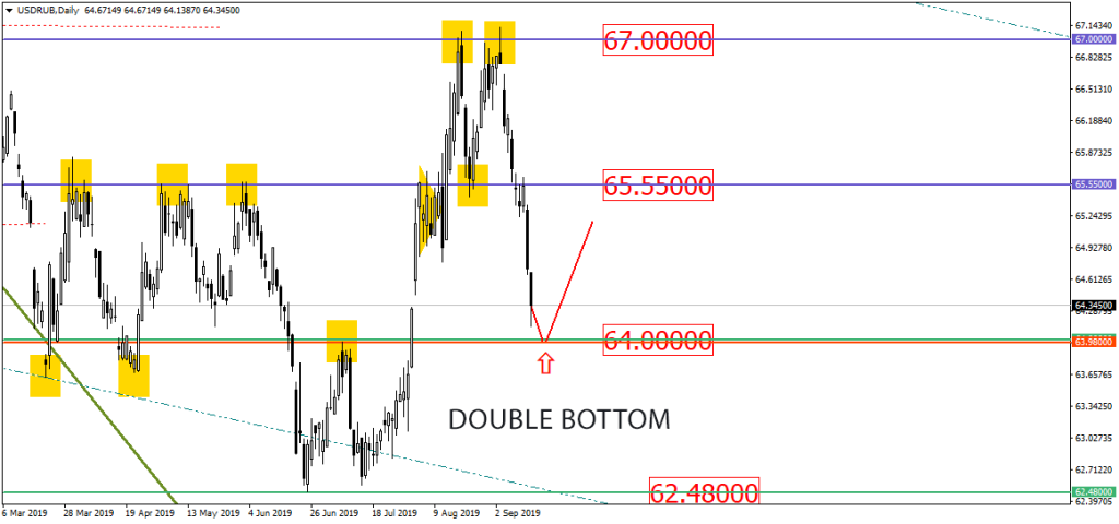 Пара USD/RUB на прошлой неделе решила не испытывать судьбу и прорвала диапазон 65.55-67.00, резко метнувшись вниз. Следующая серьезная поддержка ожидает пару возле уровня горизонтального «психологического» уровня 64.00, который также является пробитой линией шеи двойного дна, и от которой стоит ожидать потенциальный рост котировок. В общем, у нас намечается новый диапазон – 64-65.55:
