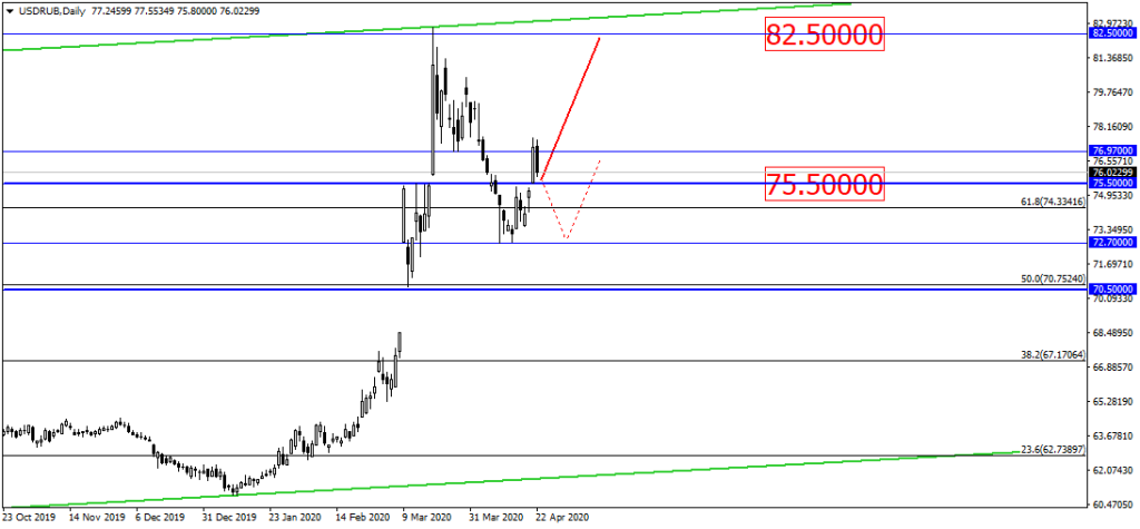 Пара USD/RUB, после коррекции ниже 75.70, продолжила свое восходящее движение на падении нефтяных цен. Сейчас цена откатывается к горизонтальному уровню 75.50, от которого котировки и могут продолжить свой рост. В, принципе, при текущих ценах на нефть Urals, курс 80+ является делом ближайшего времени, что и будет первым потенциальным уровнем роста (82.50):