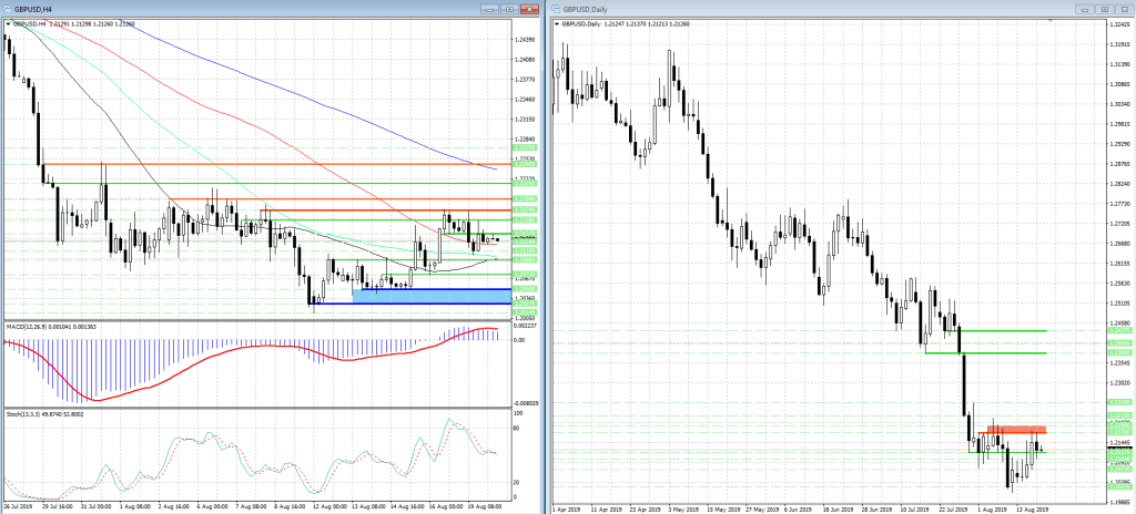 - Курс валюты зажат между скользящей средней с периодом 144 (уровень сопротивления 1.2237) с одной стороны и средних с периодами 89, 55 и 34 (ряд уровней поддержки 1.2120, 1.2102 и 1.20975) с другой.