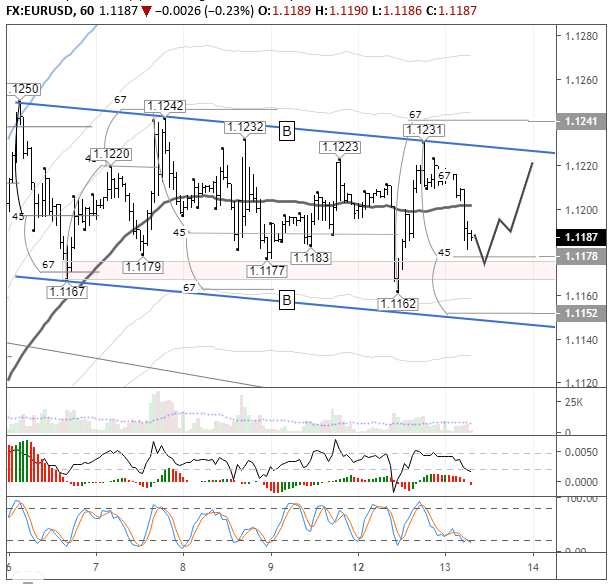 Минимумы 1,1167, 1,1179 и 1,1177 были обновлены. Продавцы собрали стопы под ними, поэтому теперь нужно ожидать обновления максимумов 1,121, 1,1242 и 1,1250. Цена находится под балансовой линией около 45 градуса. Мы ожидаем тест 45 градуса и отскок к верхней линии канала 1,1225.