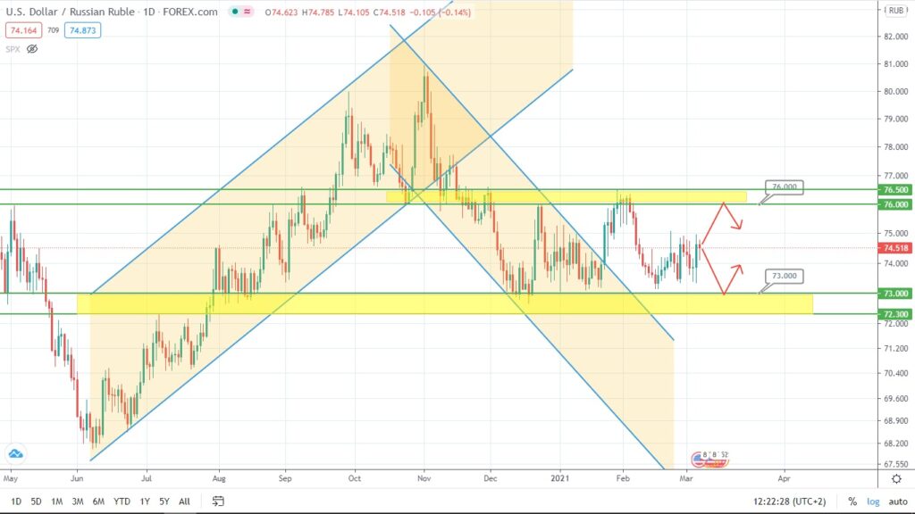 Российский рубль вторую неделю подряд ходить в узком диапазоне, периодически глядя то в сторону уровня 76.00, то в сторону горизонтали 73.00. Пока что стоит ожидать отскока от этих уровней внутрь диапазона: