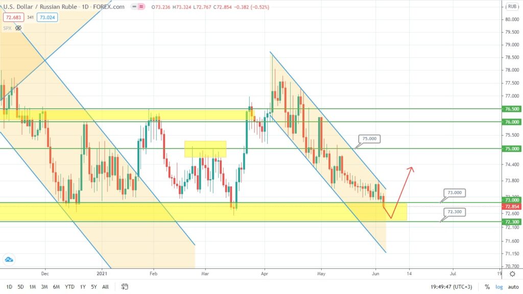 Российский рубль вошёл в область поддержки, сформированную между уровнями 72.30-73.00, где у котировок серьёзно возрастают шансы остановиться и сменить своё падение – ростом. Здесь важно отметить, что у цен есть ещё небольшой простор для падения, в район 72.50. Пока что стоит подождать и посмотреть на поведение цены возле наших горизонталей, чтобы увидеть окончательное решение рубля про изменение направления: