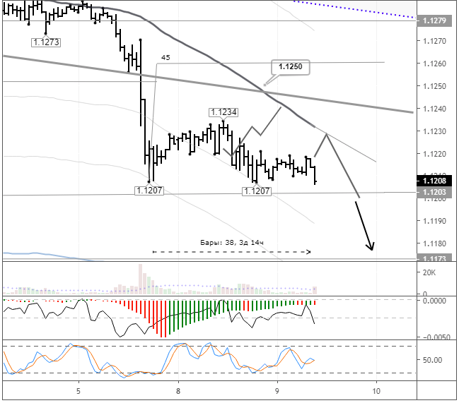 Наши ожидания по коррекции цены к Lb не оправдались. Рост котировок застопорился на уровне 1,1234. До цели покупатели не дошли 6 пунктов. Для нас было важно не достижение уровня 1,1240, а восстановление цены до балансовой линии.