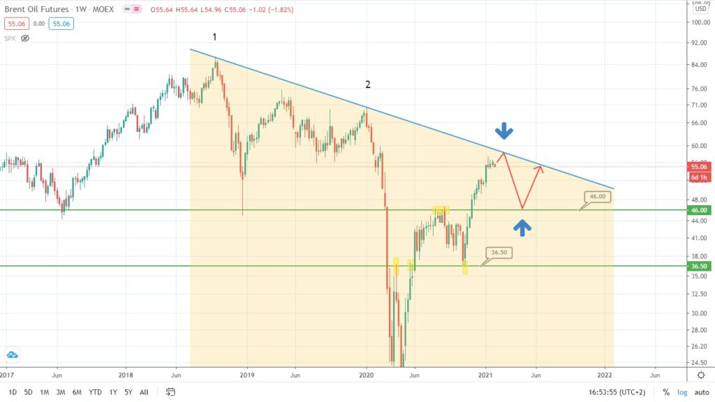 По нефти BRENT базовый сценарий остаётся прежним – отскок от сильного недельного даунтренда. Ориентировочный уровень, до которого цена может дойти и отскочить вверх – сопротивление 46.00:
