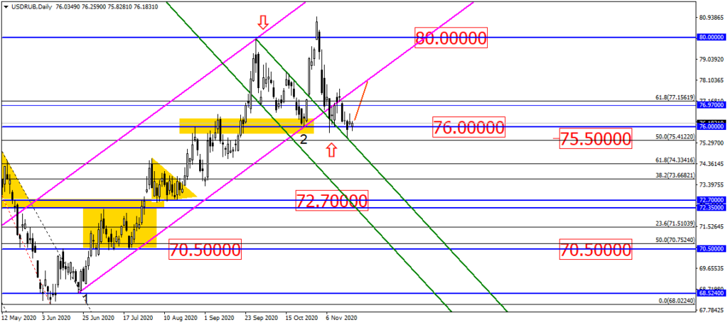 По USD/RUB ничего не меняется – уровень 76.00 пока держит оборону, поэтому рост котировок пока на переднем плане. Ближайшая цель – пробитый восходящий канал: