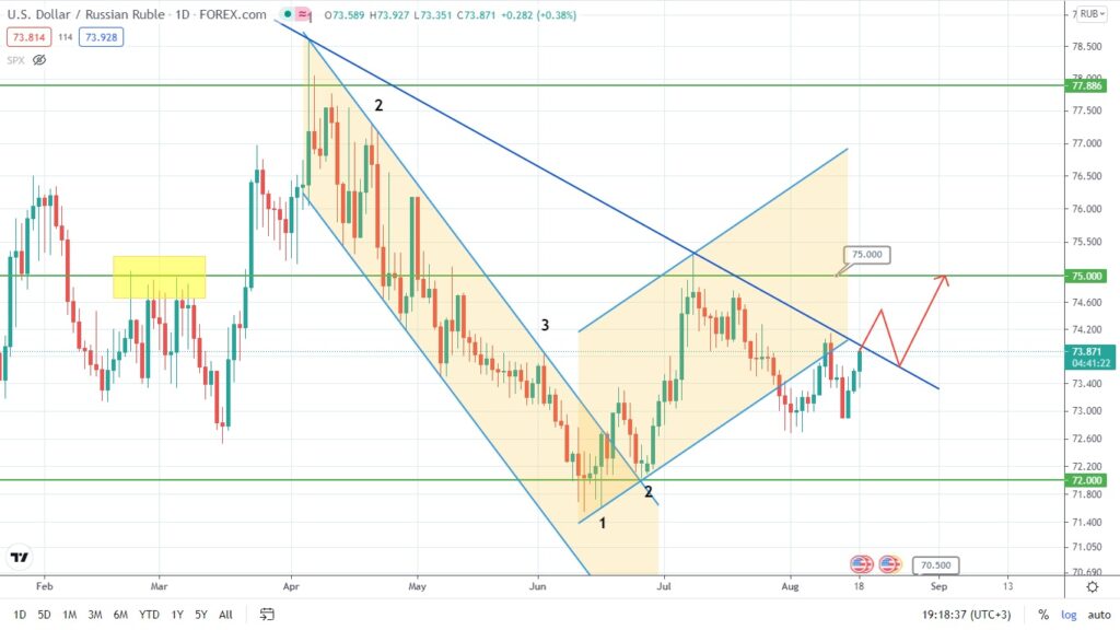 Российский рубль пока не очень спешит в сторону 72-й фигуры и сейчас штурмует дневной даунтренд. В принципе, пробитие нисходящего канала может подтолкнуть пару USD/RUB к возобновлению и усилению восходящей тенденции. Пока что стоит только понаблюдать за поведением цены возле нашей линии – пробьем или уйдём вниз: