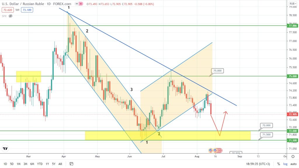 Котировки USD/RUB полетели вниз, и теперь у нас в фокусе область поддержки, сформированная между уровнями 71.50-72.00. Вот от этих уровней и ждём отскока цен вверх, при этом стоит понаблюдать за поведение цены около указанных цифр: