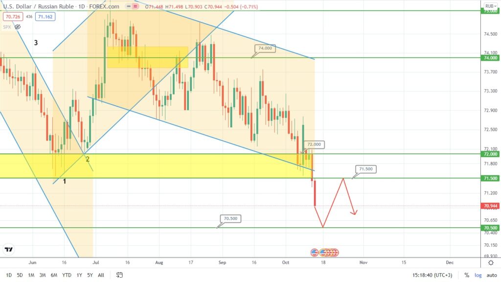 Российский рубль пробил ключевую поддержку в районе 71.50 и устремился вниз, в сторону поддержки 70.50. Пока что, для валютной пары, вырисовывается диапазон цен 71.50 и 70.50, от которых, потенциально, и ждём отскоки цен внутрь диапазона: