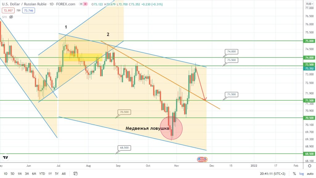 Российский рубль коснулся линии нисходящего канала и уровня сопротивления 73.50, поэтому при открытии рынка возрастает вероятность разворота и снижение котировок, к потенциальной цели 71.50: