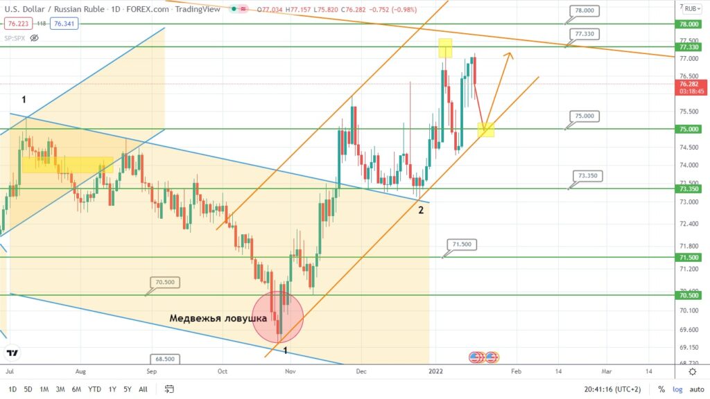 Пара USD/RUB, после попыток роста, всё-таки решила скорректироваться вниз. На юге у котировок материализуются две интересные линии: аптренд и горизонталь 75.00. В принципе, на отскок от этих линий пока и будем ориентироваться. Но от рассмотрения цели в 78.00, между прочим, пока тоже не стоит отказываться: