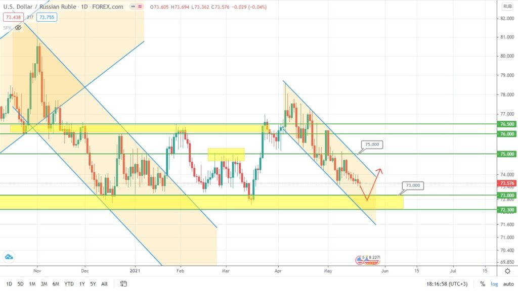 Российский рубль, мелкими шажками, но фактически вплотную приблизился к важному уровню поддержки 73.00, отскок от которого можно предполагать с большой вероятностью. Важно только посмотреть, как будет вести себя цена на горизонтали, чтобы принимать решение о дальнейшем развитии ситуации: