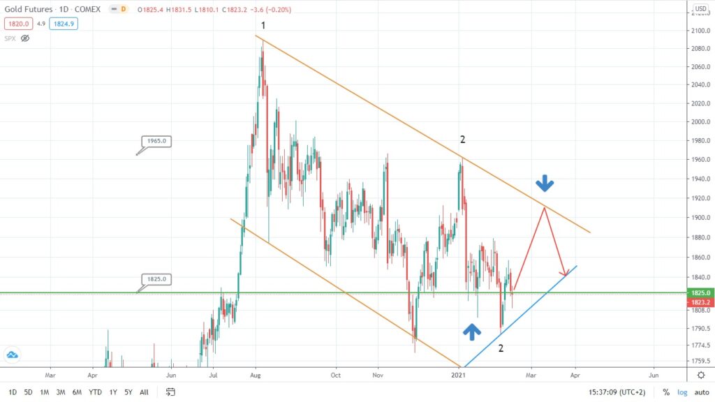 По золоту цена выбирает себе направление движения и ориентировочная линия отскока вниз – нисходящий канал. Уровень 1825.00 будет служить вариантом поддержки для цены и развитием восходящего движения: