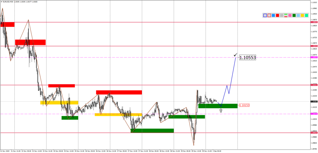 Пара EURUSD на прошлой торговой сессии снизилась к локальному минимуму на отметке 1,0981, где встретила поддержку со стороны покупателей на уровне 1,0992, который не смогла преодолеть и выросла выше, отметившись на уровне 1,1028. Таким образом, предположения о росте цены подтверждаются. На сегодня дневной уровень поддержки находится на 1,1015 (зеленая зона), который, вероятно, будет сдерживать снижение цены. Тест и отбой от этого уровня откроет дорогу росту цены к уровню сопротивления на 1,1055.