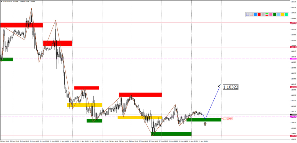 Пара GBPUSD на прошлой торговой сессии продолжила снижение до отметки 1,2899, где встретив поддержку со стороны покупателей, остановилась и начала расти. Сценарий на продолжение текущего роста остается все еще в силе и можно предполагать еще одну восходящую волну. Дневная поддержка ожидается на уровне 1,2900 (зеленая зона), которая, вероятно будет сдерживать дальнейшее снижение цены. Тест и отбой от этого уровня откроет дорогу росту к уровню сопротивления на 1,2971.