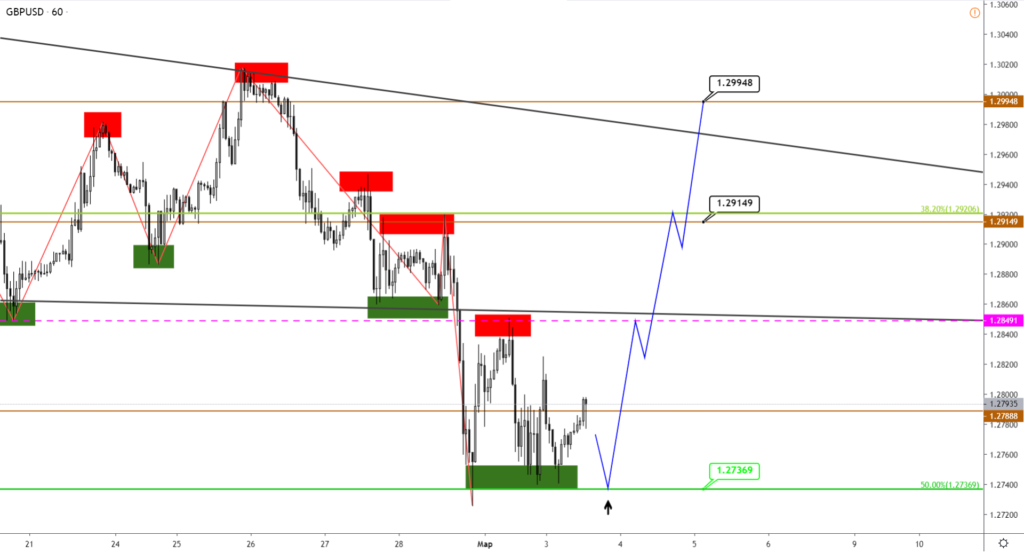 Британский фунт в своем снижении, похоже, достиг своего коррекционного дна и есть вероятность скорого возобновления ранее начатого восходящего импульса. Пара достигла отметки 1,2736, добравшись не только до целевой зоны на 1,2849, но и значительно превысив ее. На данный момент цена торгуется выше уровня 1,2736, который выступает 50%-ным уровнем коррекции Фибоначчи от предыдущего восходящего тренда, что также является сильным основанием для разворота, или по крайней мере, его приближения. Поэтому данный сценарий актуален, пока пара находится выше этого уровня. При окончательном отбое от него цена направится к ближайшим целевым отметкам на 1,2914 с проходом до 1,2994.
